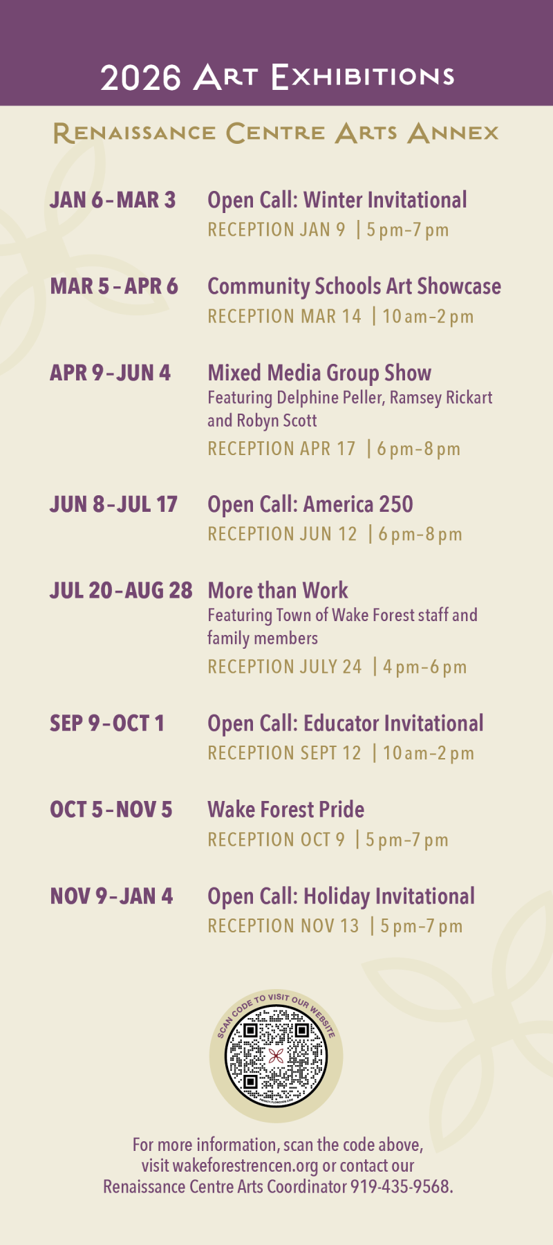 For more information, contact RC Arts Coordinator April Cannon at 919-435-9568 or acannon@wakeforestnc.gov.